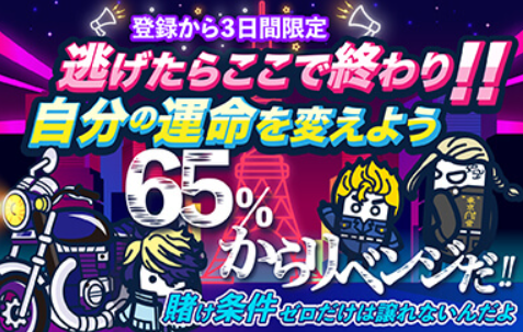 - 初回入金3日限定キャッシュバックボーナス 65%