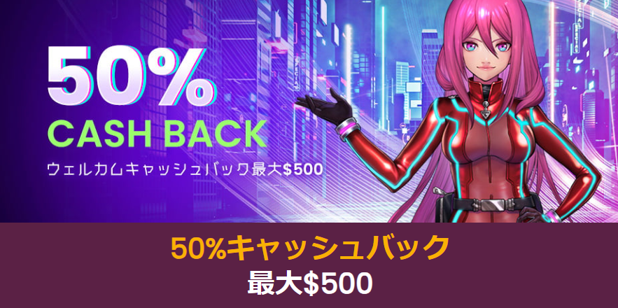 - 勝利しなかった場合(アカウント残高$1以下)は最高$500まで1倍の賭け条件のボーナスとして進呈