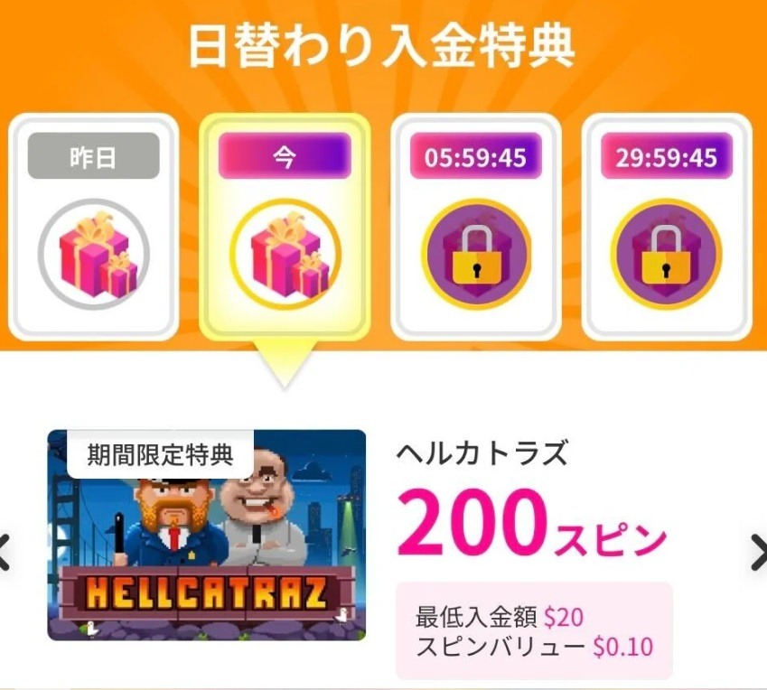 日替わりでページ内に表示されている最低入金額以上を入金すると無料フリースピンがもらえます。