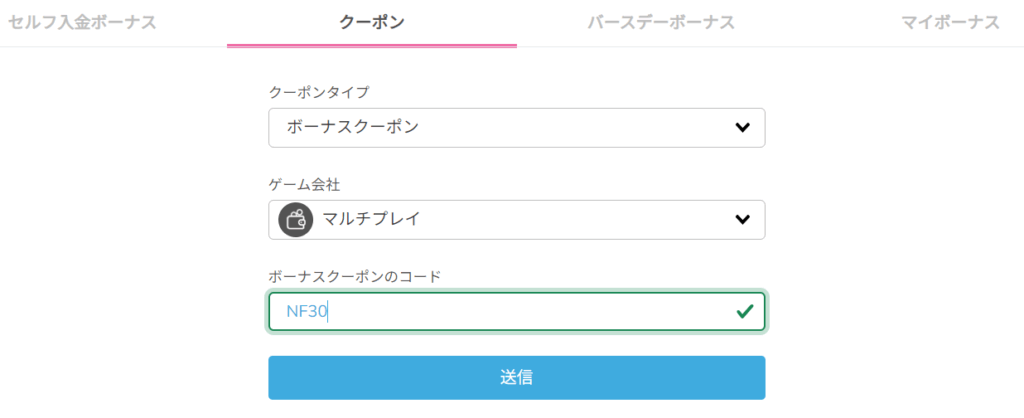 ボーナスクーポンコードに【NF30】と入力し【送信】ボタンを押すと選択したゲーム会社に$30が反映されます。