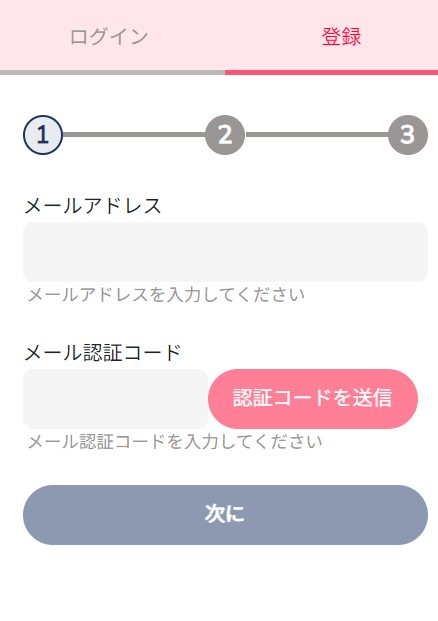 1. メールアドレス、認証コードを入力し【次ぎ】を押す