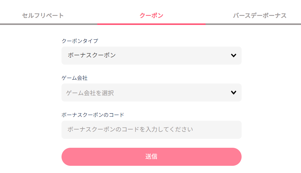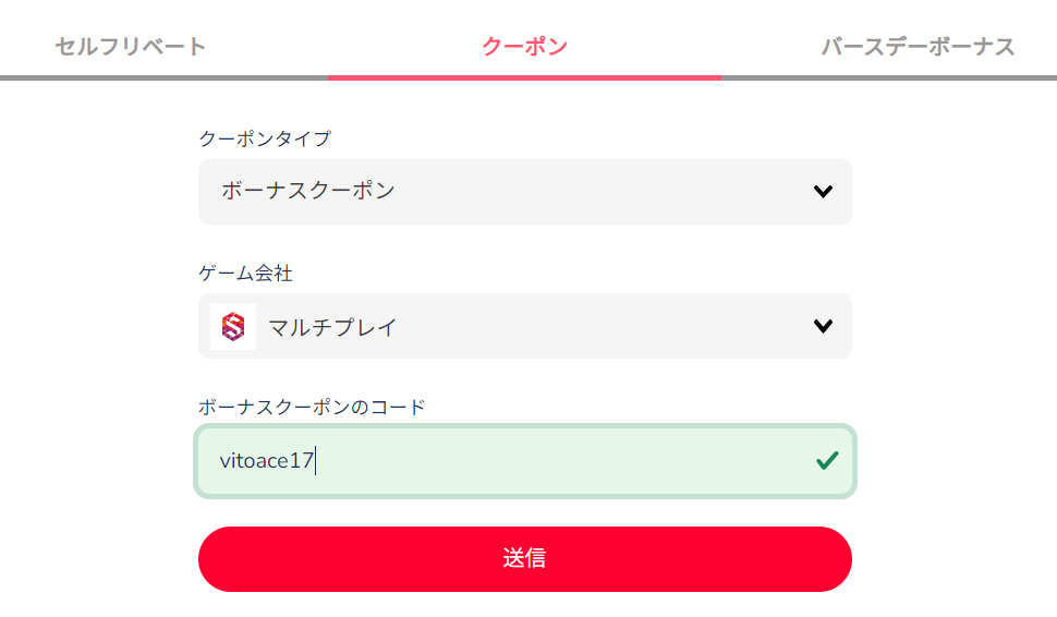 遊びたいゲーム会社とクーポンコード【vitoace17】を入力し【送信】ボタンを押します。