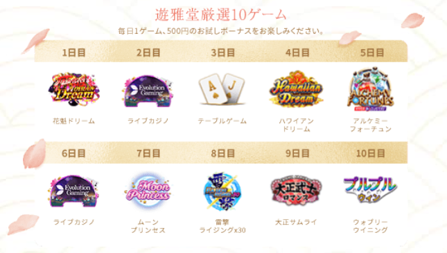 遊雅堂(ゆうがどう)のボーナスはかなり豪華になっています。また、日本円で遊べると資金管理もしやすいです。