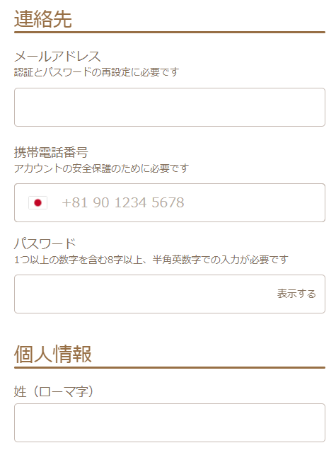 - メールアドレス、電話番号、パスワード、個人情報を入力する。